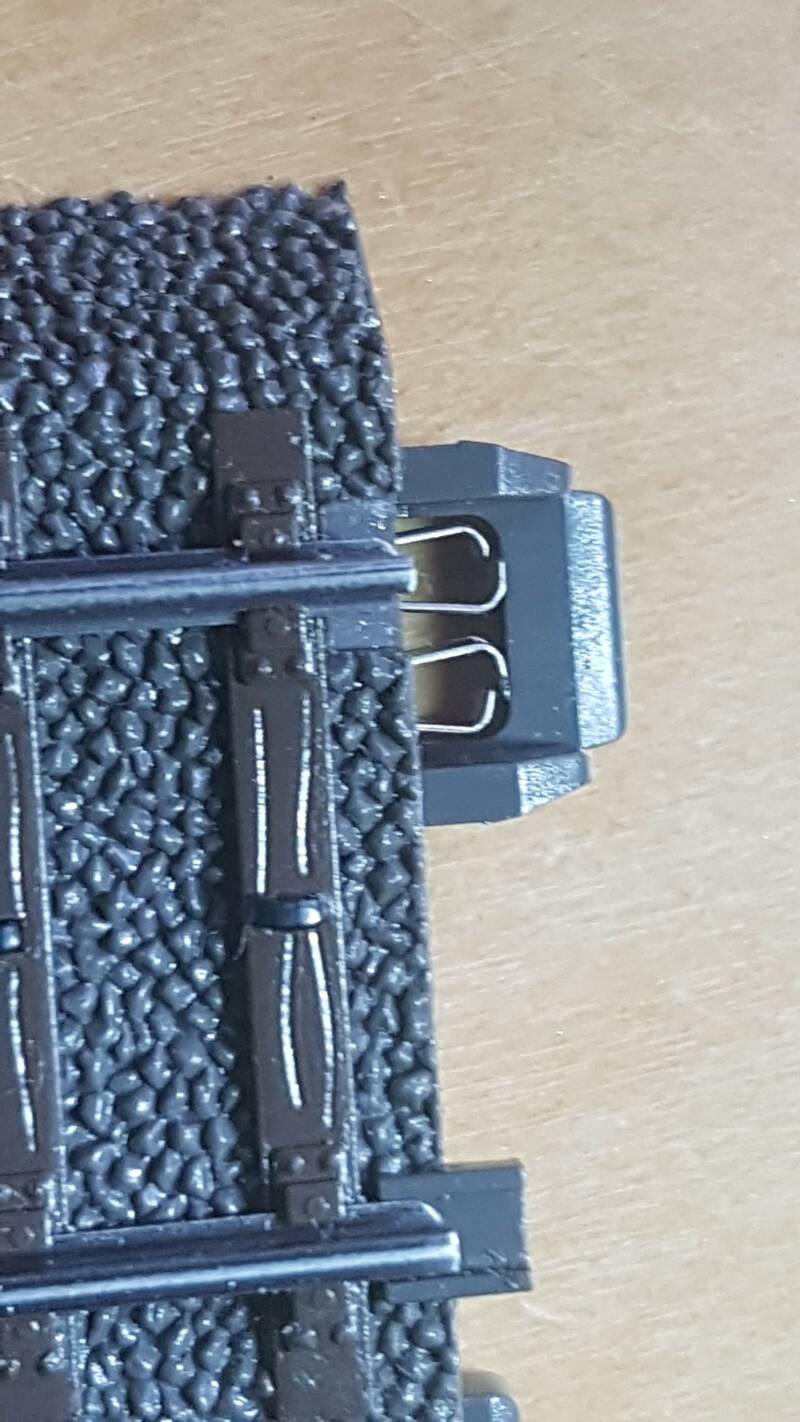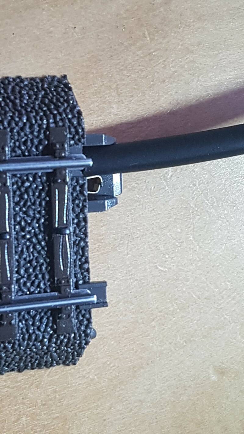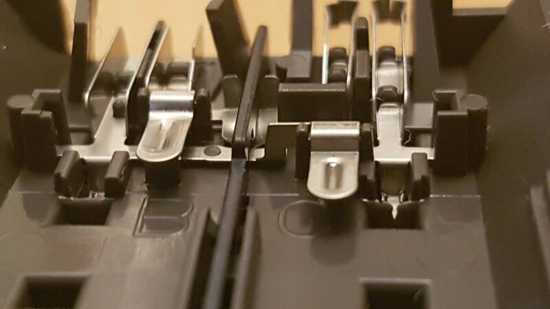 Als je de C-rails omdraait zie je 2 lipjes en wat ijzerwerk daaromheen. Bij het rechter lipje zie je links een klein bruggetje zitten die contract maakt met de andere spoorstaaf. Knip je dit door, je kan het ook door slijpen met een dremel of iets dergelijks, dan haal je de verbinding weg tussen de 2 rails. Hierdoor kan je heel goedkoop een bezetmelder maken.