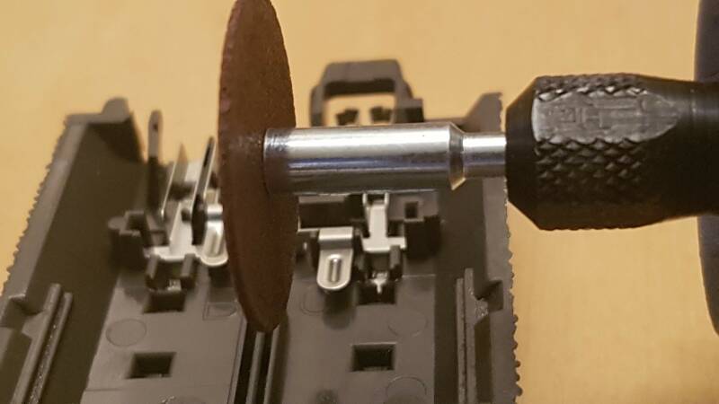 Plaats de dremel en slijp voorzichtig de brug door. Er blijft een grote kans dat je ook wat kunstof mee slijpt maar meestal is dat niet echt heel erg. Wel goed blijven opletten dat je niet te ver gaat.